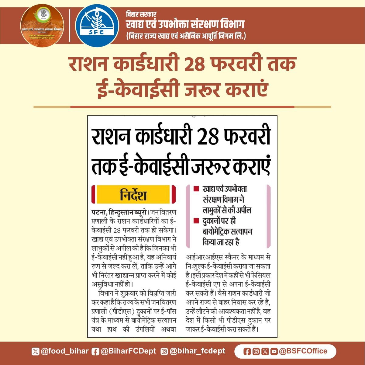 28 फरवरी 2026 तक सभी राशन कार्ड धारकों को E-KYC कराना अनिवार्य है। इसलिए आप सभी राशन कार्ड धारी समय रहते हुए अपना E-KYC करना सुनिश्चित करें।यदि तय तारीख तक E-KYC नहीं कराई गई, तो: